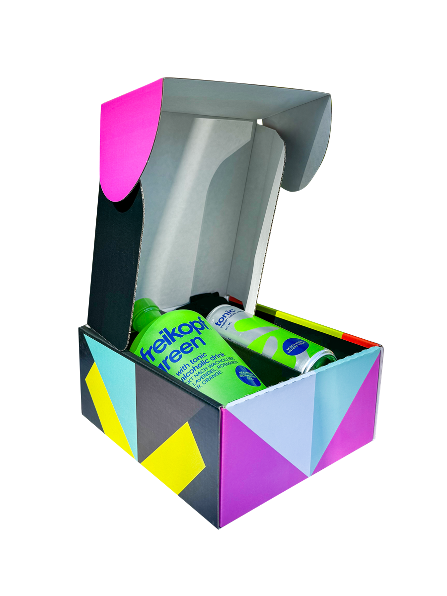 Drin steckt: eine Flasche freikopf green, eine Dose freikopf indian tonic, ein exklusiver Jutebeutel mit dem Statement „nüchtern betrachtet geil“ und ein schicker Geschenkkarton für den perfekten Überraschungsmoment.