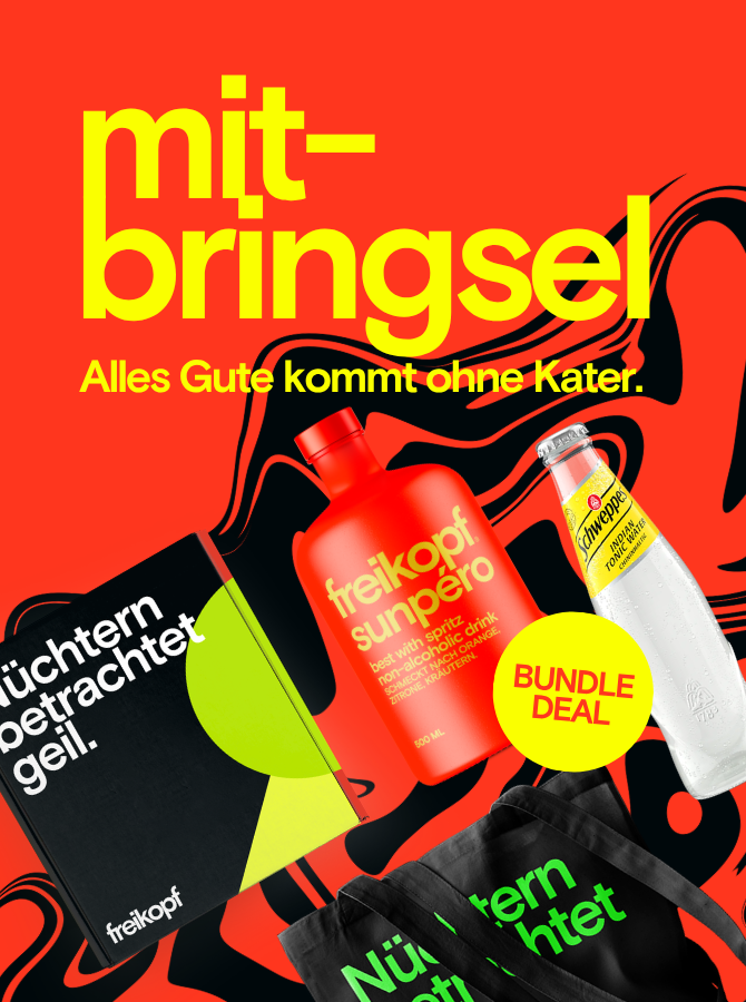 Drin steckt: eine Flasche freikopf sunpéro, eine Flasche Schweppes Indian Tonic, ein exklusiver Jutebeutel mit dem Statement „Nüchtern betrachtet geil.“ - verpackt im schicken Geschenkkarton für den perfekten Überraschungsmoment.